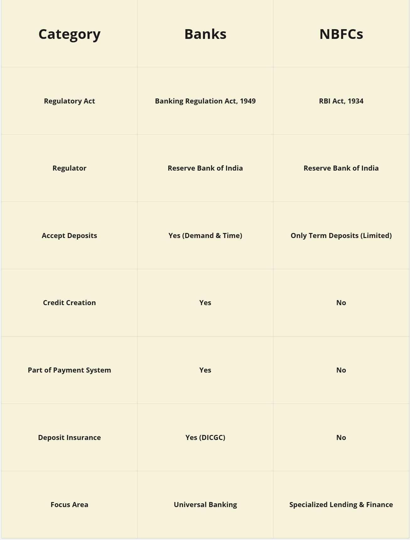 NBFCs, in contrast, specialize in lending, asset financing, leasing, hire purchase, and investment activities, often catering to customer segments underserved by banks.