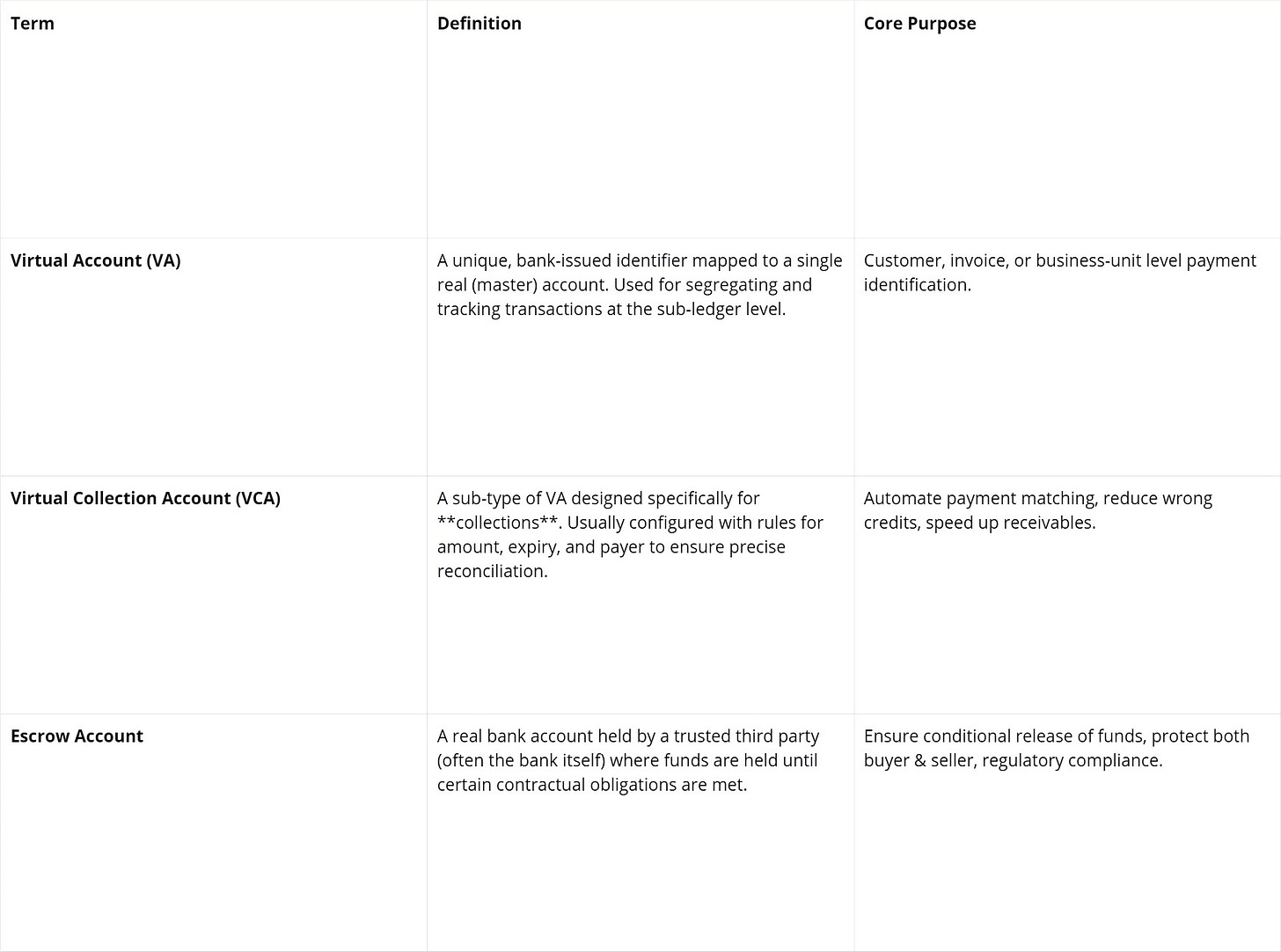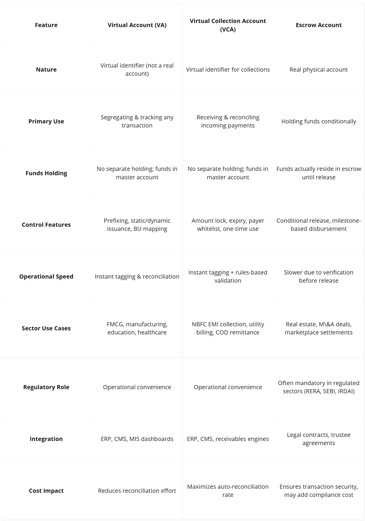 Virtual Accounts (VAs), Virtual Collection Accounts (VCAs), and Escrow Accounts.